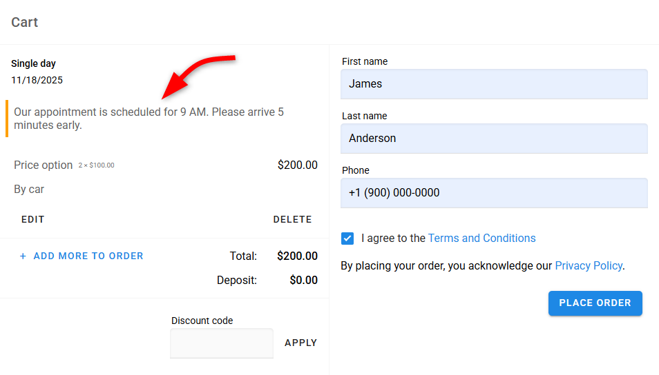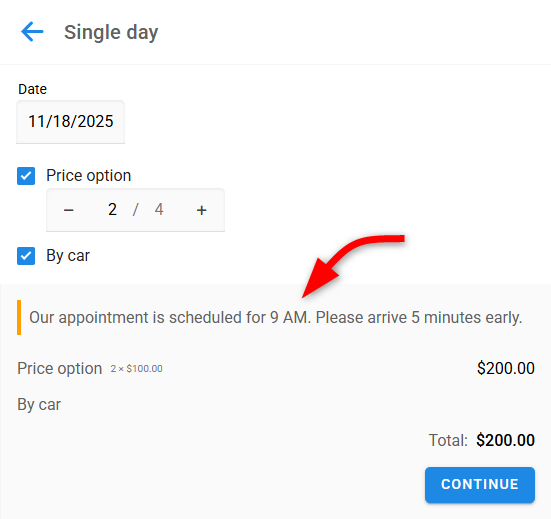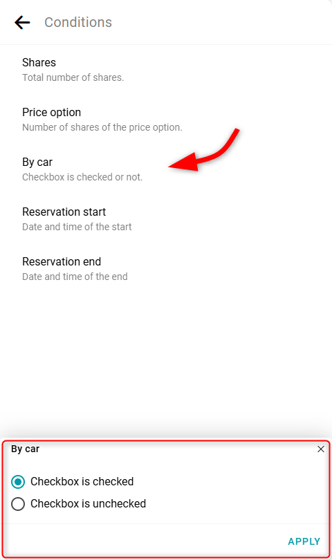 In the list, select the field "By car" with the Checkbox is checked condition. The warning will be shown when the customer selects the By car checkbox. Save your changes.