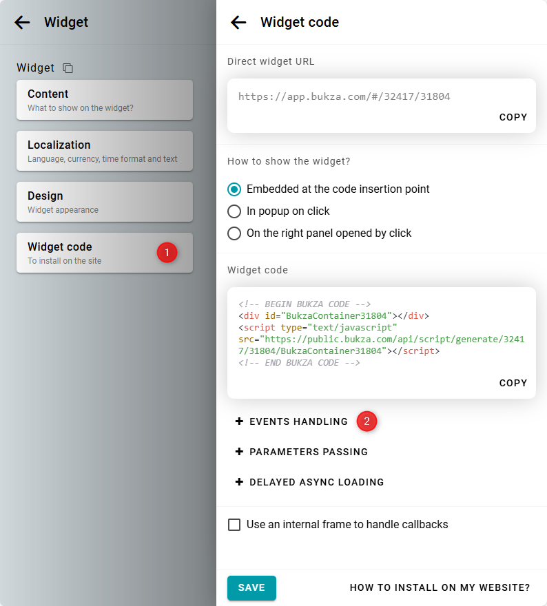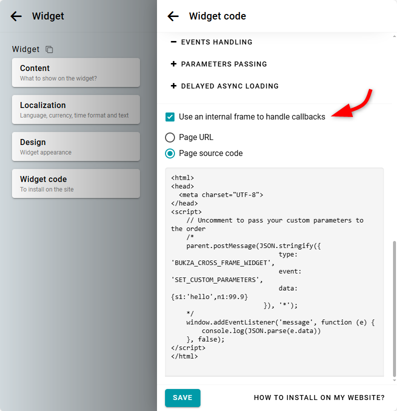 In some cases, you may not be able to add the widget code with an event handler directly to your page. This can happen if the widget is installed on social networks or if you provide customers with a direct link to the widget. In such situations, you can run your code directly inside the widget using an internal frame.