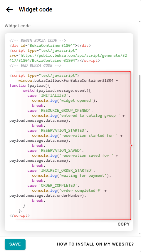 - RESERVATION_STARTED — Triggered when a resource is opened for booking. Passes the parameters name and resourceId.