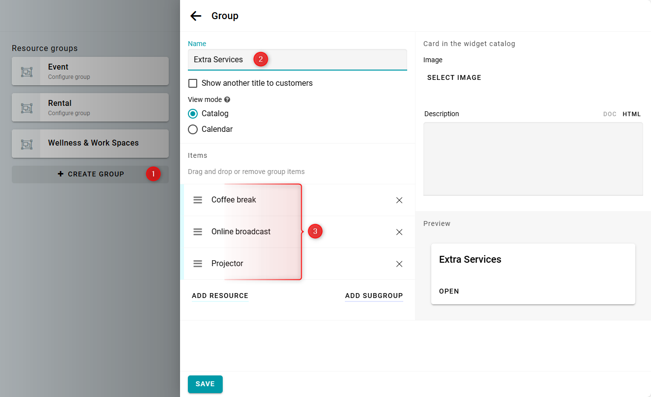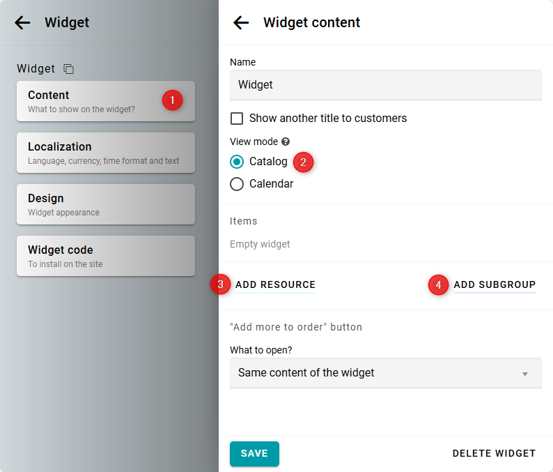 To set up the catalog in the widget, open its settings and go to the Content panel. Add resources and nested groups in the same way. Save your changes.