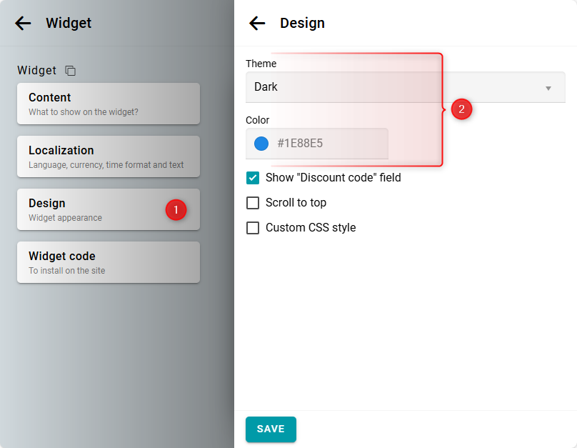 In the Design panel, select either the light or dark theme to match your website's design. Next, choose an accent color for the buttons and form fields.