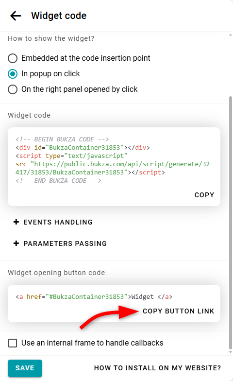 Paste the copied link into any button or anchor on your website. When this button is clicked, the widget will open in the selected mode.