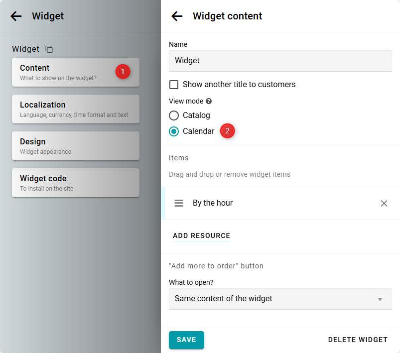 To display the resource calendar immediately, open the widget settings, go to the Content panel, and set the View mode to Calendar.