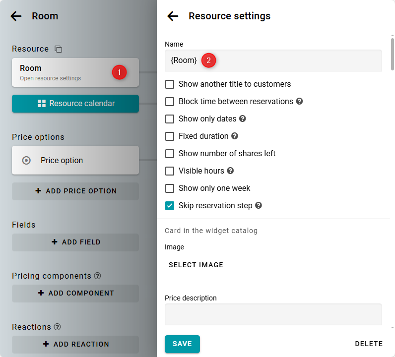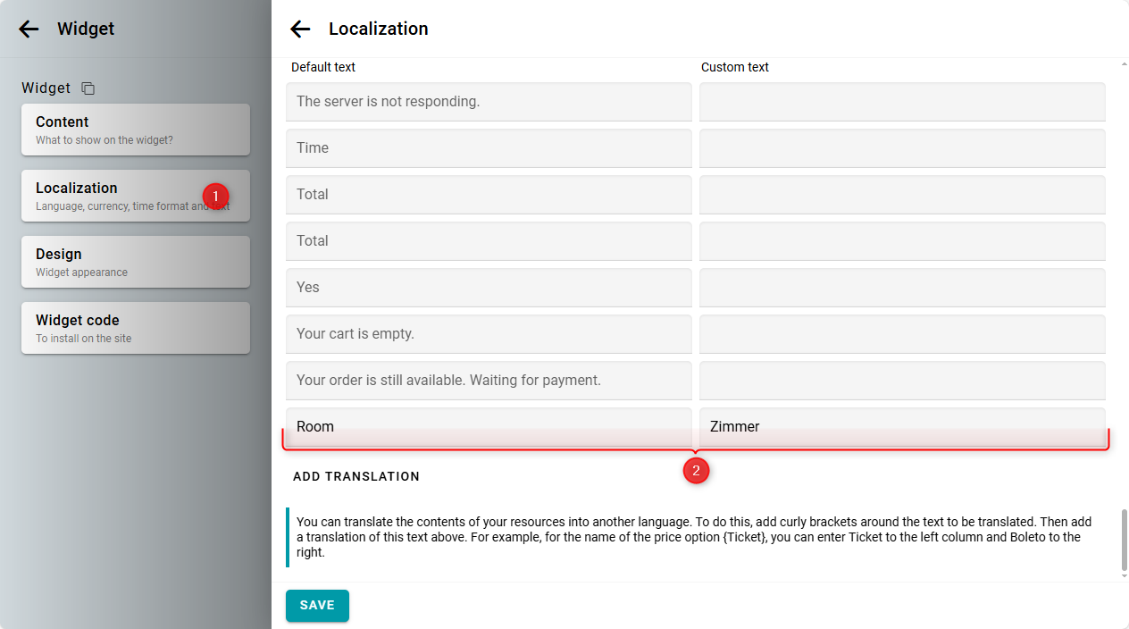 Here, you can add translations for your descriptions and the names of your resources, price options, fields, reactions, and more. To do this, add a new translation key, for example, Room. Then enter the translation, such as Zimmer.
